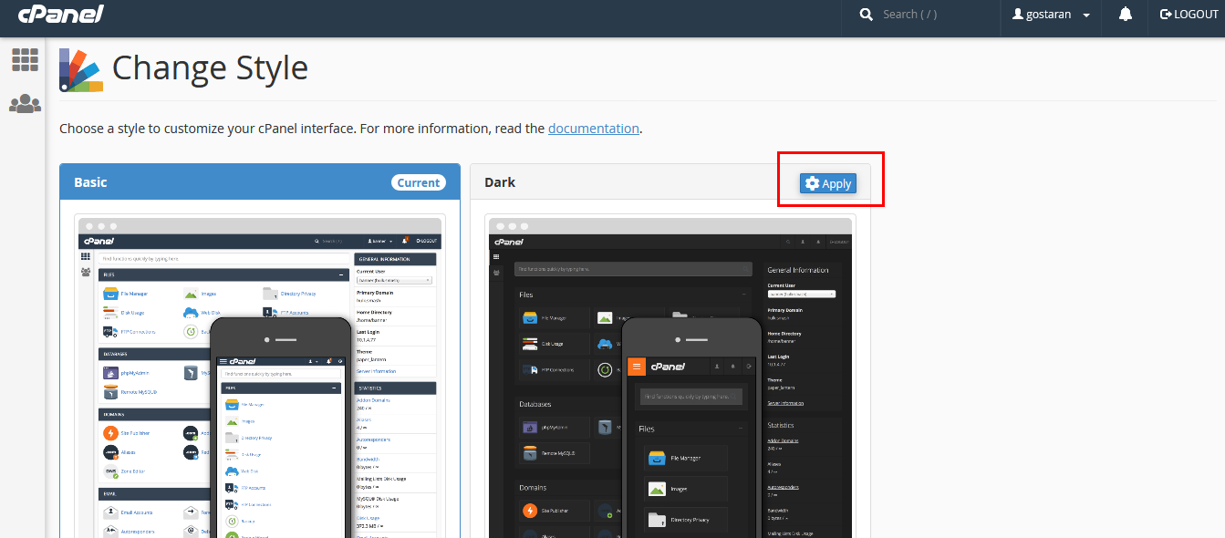 قدم دوم: تمام قالب های موجود سی پنل به شما نمایش داده میشود و شما میتوانید با کلیک بر روی Apply آن را انتخاب کنید در قالب های قبلی سی پنل بیشتر با قالب retro نمایش داده میشود اما بعد از بروزرسانی ها انتشار نسخه جدید سی پنل بیشترین قالبی که استفاده میشود و محبوب شده است قالب Basic است .