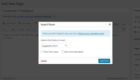 هنگامی که شما بر روی دکمه افزودن فرم در پنجره کلیک میکنید، این کار فرم کوتاه انتقادات وپیشنهادات را به ویرایشگر پست اضافه می کند. شما می توانید پیش بروید و پست / صفحه خود را ذخیره یا منتشر کنید.