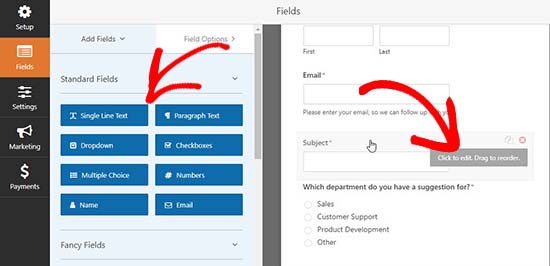 شما  می توانید در قالب WPForms تغییراتی ایجاد کنید و با کشیدن و رها کردن امکاناتی را از سمت چپ به سمت راست بکشید.