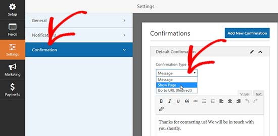 اول، شما می توانید تنظیمات تأیید فرم را ویرایش کنید. به سادگی به تب ‘تأیید’ بروید و یک نوع تأیید را از منوی کشویی انتخاب کنید تا تنظیمات را تغییر دهید.
