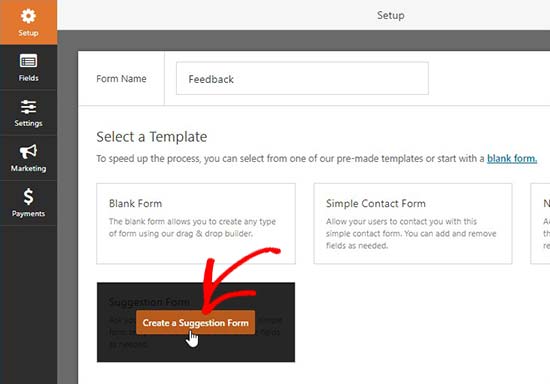 افزونه فرم ساز WPForms به سادگی و اضافه کردن یک اسم برای فرم و کلیک بر روی ساخت فرم (create Suggestion Form) فرم خود را بسازید.