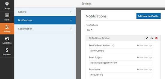 بعدا می توانید به برگه «اطلاعیه ها» بروید. تنظیمات پیش فرض فرم را تغییر دهید یا به همان صورت پیش فرض باشد.