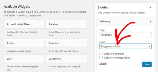 به همین سادگی یک عنوان برای ویجت فرم انتقادات وپیشنهادات اضافه کنید و فرم خود را برای نشان دادن آن در نوار کناری انتخاب کنید. اطمینان حاصل کنید که بر روی دکمه “ذخیره” کلیک کنید.