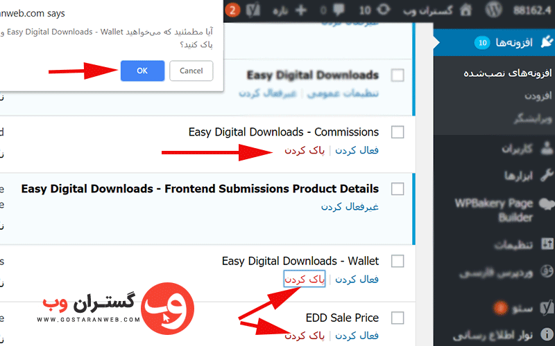 اگر افزونه ای که می خواهید حدف کنید فعال است ابتدا غیرفعال کنید تا گزینه ی پاک کردن زیر افزونه نمایان شود باکلیک بر روی پاک کردن پیغامی در بالای صفحه نمایان می شود که آیا مطمئن هستید که این افزونه را پاک کنید که شما باید بر روی ok کلیک کنید تا تیید کنید که افزونه حذف شود.