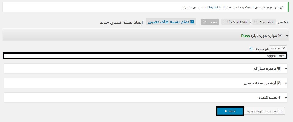 قدم سوم : بعد از کلیک بر روی ایجاد بسته نصبی یک صفحه مانند صفحه زیر نمایش داده می شود که باید نام بسته نصبی را بنویسید. بعد از نوشتن نام بسته نصبی بر روی ادامه کلیک کنید. برای یادگیری بیشتر به تصویر زیر نگاهی کنید :