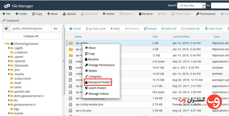 قدم سوم: توی این بخش فایل های مربوط به سایت شما وجود دارد شما میتونید هر پوشه ای که نیاز به رمز گذاری باشه بر روی آن راست کلیک کنید و روی password protect کلیک کنید .