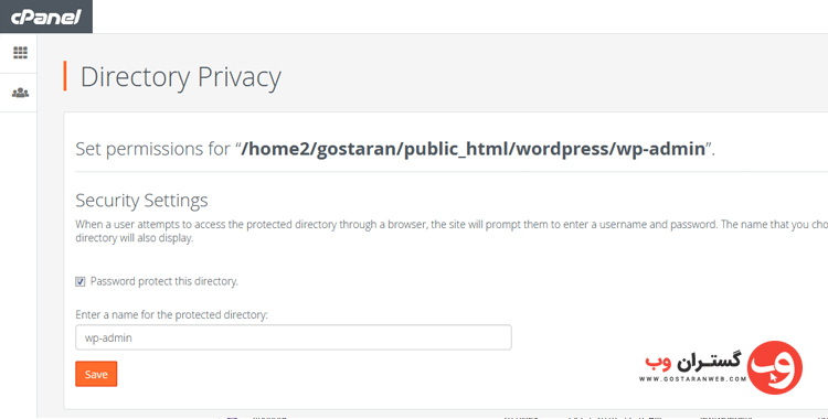 قدم چهارم : شما هم اکنون وارد وارد صفحه Directory Privacy شدید در همان بالا این بخش در قسمت Set permissions for بخشی که در حال رمز گذاری است را مشاهده میکنید در قسمت پایین یک گزینه ای وجود دارد به نام Password protect this directory که باید تیک آن را بزنید این گزینه میگه رمز گذاری را برای این پوشه را فعال کن . در بخش پایین Enter a name for the protected directory پوشه ای که قرار است رمز گذاری بشه در اینجا تایپ میکنیم ما در اینجا wp-admin را تایپ میکنیم و در نهایت بر روی save کلیک میکنیم .