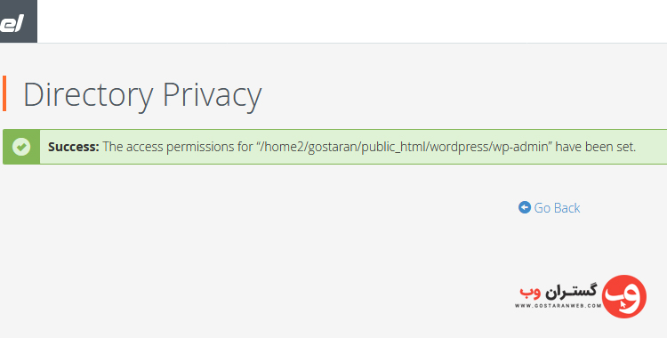 قدم پنجم : در این قسمت success پیغام موفقیت مشاهده میکنید و شما باید بر روی Go Back کلیک کنید تا به صفحه رمزگذاری Directory Privacy برگردید .