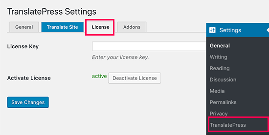 ابتدا ، شما نیاز به تغییر زبانه مجوز و وارد کردن کلید مجوز خود دارید . شما می توانید این اطلاعات را در حساب کاربری خود در وب سایت TranslatePress پیدا کنید . پس از آن شما باید تنظیمات دیگر را در برگه تنظیمات عمومی تغییر دهید .