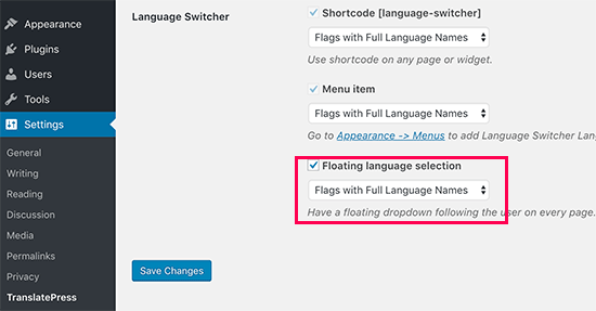 به صفحه تنظیمات افزونه و به قسمت سوئیچ زبان بروید . از اینجا اطمینان حاصل کنید که جعبه کنار گزینه انتخاب شناور انتخاب شده است .