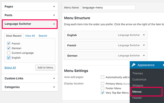 به سادگی به Appearance بروید “صفحه منوها و بر روی زبانه Language Switcher در ستون سمت چپ کلیک کنید . اکنون زبانهایی را که میخواهید نمایش دهید انتخاب کنید و سپس بر روی افزودن به دکمه منو کلیک کنید .