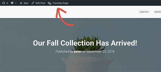 TranslatePress اجازه می دهد تا شما فورا شروع به ترجمه هر صفحه یا پست در سایت خود در زمانی که وارد سیستم میشوید بکنید . به سادگی با کلیک بر روی صفحه ترجمه در بالا برای ورود به ویرایشگر این کار را انجام دهید .