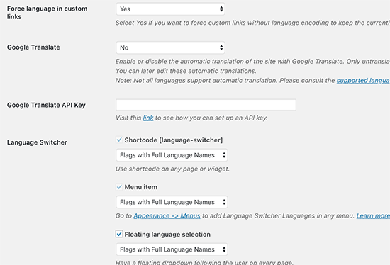 این کار به شما در تنظیمات بعدی ، ‘زبان در لینک های سفارشی’ را به ارمغان می آورد . گزینه پیش فرض “بله” است ، زیرا لینک های سفارشی را برای زبان های ترجمه تغییر می دهد که URL ها را دوستانه تر می کند . حال باید انتخاب کنید که آیا می خواهید از ترجمه گوگل برای ترجمه خودکار استفاده کنید یا خیر . انتخاب پیش فرض “نه” است ، اما اگر می خواهید از ترجمه گوگل استفاده کنید ، می توانید آن را تغییر دهید .