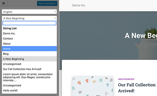 اکنون به زبان مورد نظر خود زبان انگلیسی ترجمه کنید و سپس ترجمه خود را ارائه دهید . پس از ورود به ترجمه، روی دکمه Save Translation در بالای صفحه کلیک کنید و سپس روی دکمه بعدی کلیک کنید . TranslatePress به طور خودکار رشته بعدی را در صفحه برای شما ترجمه می کند . شما همچنین می توانید فقط بر روی منوی کشویی زیر زبان پیش فرض خود کلیک کنید و لیستی از رشته های متن قابل ترجمه را در صفحه نشان می دهد . شما می توانید یک رشته را انتخاب کنید و سپس ترجمه آن را ارائه دهید .