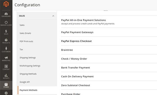 مجنتو همراه با PayPal، Authorize.net ، تحویل نقدی ، تحویل بانک ، و روش پرداخت سفارش خرید به طور پیش فرض است . همچنین دارای پسوند برای بسیاری از درگاههای های پولی محبوب مانند Stripe ، 2Checkout، Braintree، WePay، Google Checkout، Skrill و غیره است .