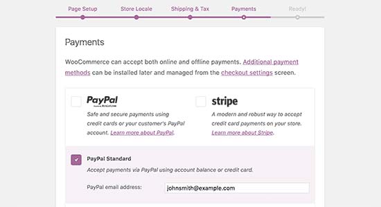 ووکامرس به طور پیش فرض پرداخت PayPal و Stripe را ارائه می دهد . همچنین از تمام درگاه های پرداخت عمده از طریق extensions و addons پشتیبانی می کند .