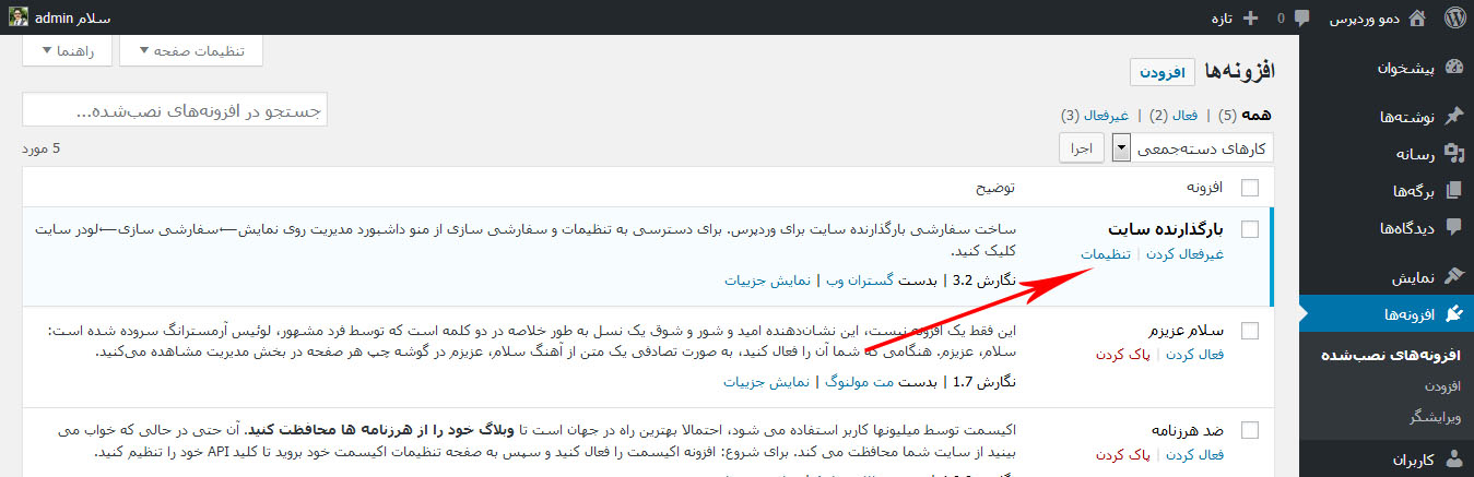 قدم دوم : در قدم بعدی میتوانید این افزونه را سفارشی سازی کنید پس در فهرست افزونه ها بر روی تنظیمات کلیک کنید .
