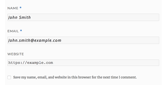 به طور پیش فرض ، فرم نظر وردپرس اولین قسمت متن نظر را نمایش می دهد و سپس نام ها ، ایمیل ها و زمینه های وب سایت . این تغییر در وردپرس ۴.۴ معرفی شد . قبل از آن ، وب سایت های وردپرس ابتدا نام ، ایمیل ، و زمینه وب سایت ها را نمایش می دادند ، و سپس کادر متن نظر را .